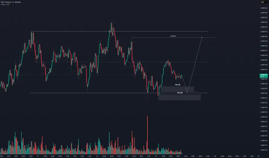 По Pepe есть с обоих сторон подтвержденный диапазон, снизу есть два 15 минутных ордерблока, верхний еще и выступает ликвидностью, в идеале с его свипа взять лонг и до верхней ликвидности, стоп под спринг