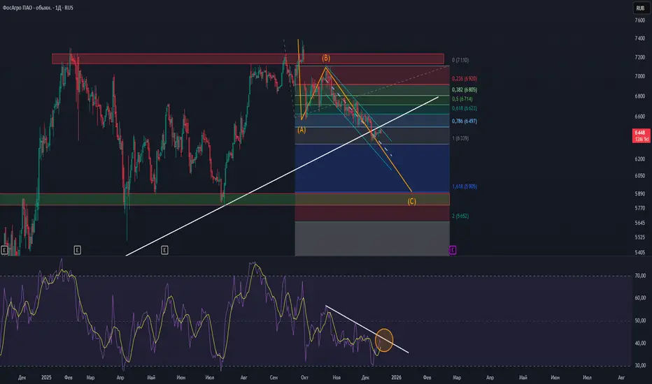 Если рассматривать этот вариант, то откладывая расширение Фибоначи ,ну какбы пытаемся понять те зоны где можем закончить эту самую волну . И вполне допускаю что можем долететь до 1.618. ,а это район цены 5900-6000 .Частенько вот такие каналы/3-е волны заканчиваются именно выходом за нижнюю границу канала (в данном случие нисходящего ) с проливом и V-образным разворотом .Там же в районе 1.618 можно отметить зону поддержки .Т.е некоторое время можем двигаться в канале и затем пролиться до 5900-6000 это около - 8,5% много но как то так . Ну вот такие вот мысли в поисках точки входа.