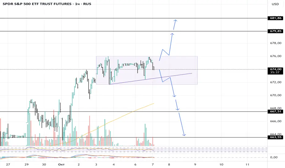 Сверху есть недобитые цели. Для лонга смотрим пробой/тест верхней границы диапазона. Цели: 679,85; 681,86.