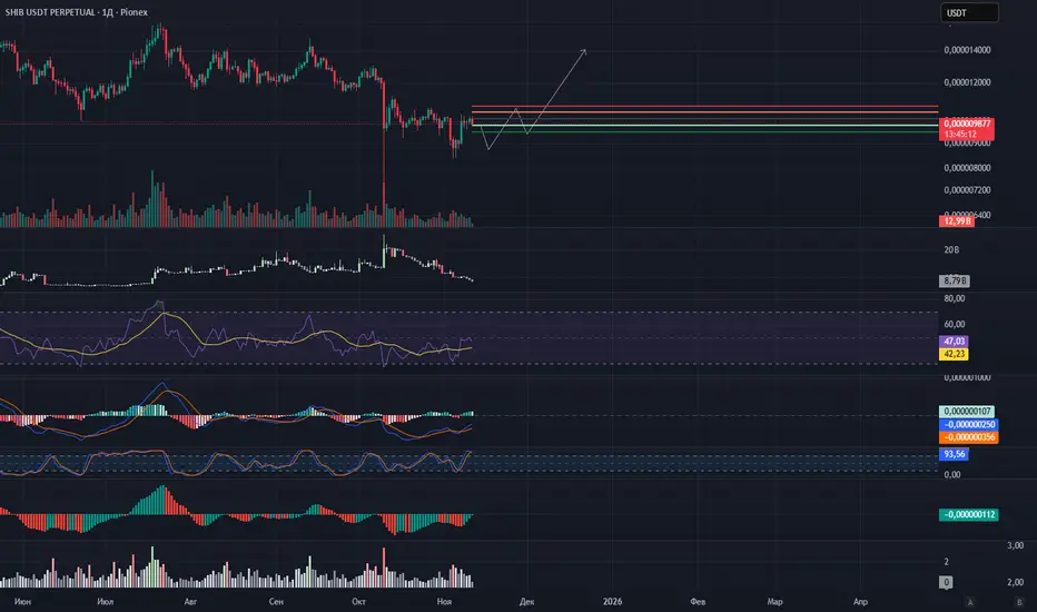 На графике видно, что цена SHIB находится в зоне консолидации после сильного снижения. Цена сейчас колеблется около 0.000009889 USDT, формируя потенциальную зону накопления.