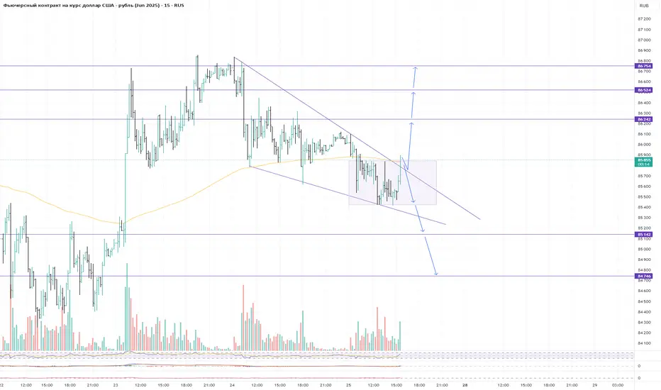 Шорт можно рассмотреть в случае возврата под границу клина. Цели: нижняя граница диапазона; 85142; 84746.