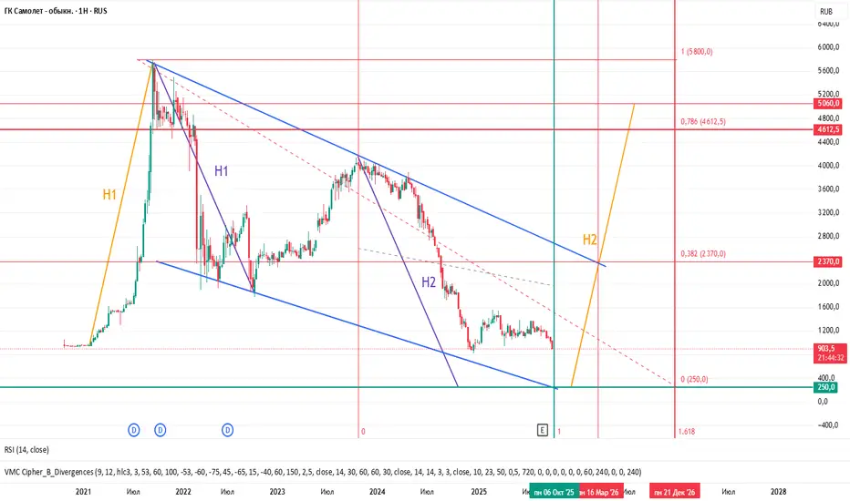Технически уровень покупки по цене 250 в октябре (конец параллельного фиолетового отрезка H2 и трендовой границы клина). Основная цель 4612 декабрь 2026 года (0.786 основная фибо и 1.618 временная фибо).