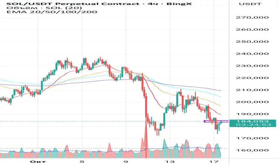 После падения с 200 → 175 сейчас идёт возврат к EMA200 (185–187$).