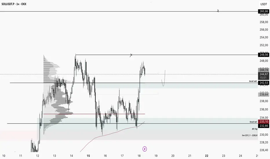 Цена уже взаимодействует с ликвидациями шортов, наиболее массивный кластер сосредоточен в диапазоне 248,2–255,8$, что может стать целевой зоной для дальнейшего движения.