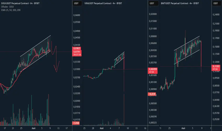 Посмотрите на два следующих графика, формация проста -> натянутое движение роста с формированием восходящего канала --> резкий дамп вниз. У SOLV формация схожая, можно забрать хороший шорт. Присмотритесь