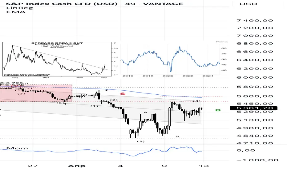 Субминуэтная волна (с) составила 1.38 Фиббоначи Субминуэтной волны (а) , образовав топ 5494, совпавший полкой сопротивления построенной по минимуму 31 марта и гэпу 2 апреля. Индикатор импульса Моментум опустился ниже нулевой отметки и не смог вернуться в пололи кольнул зону после 9 апреля. Скорость продвижения упала , это может создать предпосылку для падения ниже 5114, поэтому если индекс пробьет это основание минуэтной волны (3), альтернативный сценарий утратит силу . За предпосылку был взял импульс золота , как катализатор роста настроений , если эта предпосылка окажется ложной , длинная позиция ликвидируется.