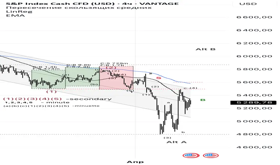 Субминуэтная волна (4) образовала зигзаг abc с вершиной в 5499, эта область совпадает с основанием минутной волны 1 и отмечена красным пунктиром, в то же время вершина субминуэтной волны (4) укладывается с дисперсию линейного тренда. Значения не должны выйти выше ма60 5352, чтобы субминуэтная волна (5) продолжила развитие Медвежьего рынка ниже 4800. Существует не определенность, что структура продолжит развитие , потому что рынок золота показал позитивные настроения для продолжения ралли , это отвечает общему инвестиционному настроению и я считаю что металл может потянуть и индексы к еще одному спекулятивному витку. Короткая позиция ликвидируется и открывается длинная с защитным стоп приказом 5114. Этот уровень будет служит также отметко к возврату а короткую позицию. Альтернативный вариант включает формирование плоской коррекции , в которой первичная волна А сформировала основание 5791, и первичная волна В может бвть ограничена 6153. Первичная волна С завершит коррекцию, обновив все минимумы года .