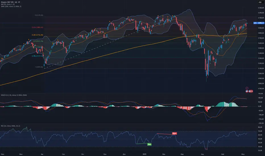 Ожидается краткосрочная консолидация, но общий тренд остаётся бычьим. Уровень 6150 является ближайшей целью в случае выхода из диапазона. При любом локальном снижении инвесторы, вероятно, будут рассматривать это как возможность для покупок. Технически рынок остаётся в сильной позиции, особенно в отсутствие признаков перегрева.