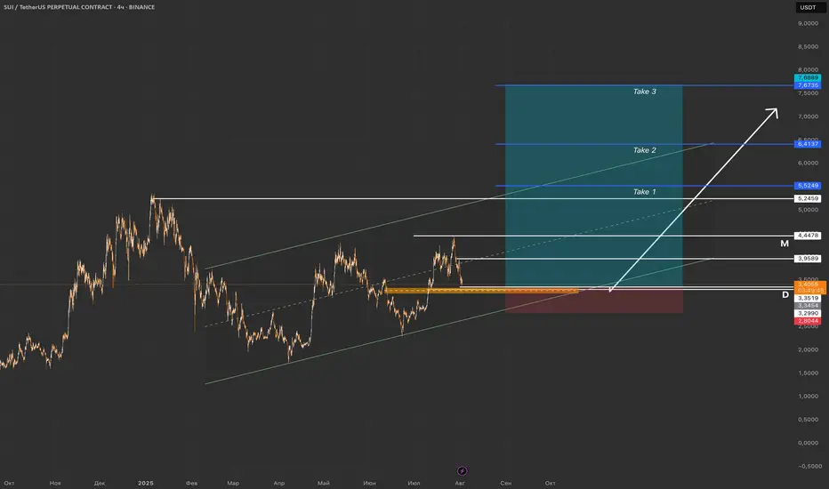 Монета постепенно приближается к ключевой зоне спроса (оранжевая область: $3.29–3,45), которая ранее уже удерживала цену.