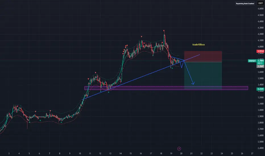 На графике видно уверенное пробитие восходящей трендовой линии. Сейчас цена формирует потенциальный ретест снизу (зона 3.91), что открывает хорошие условия для входа в шорт.