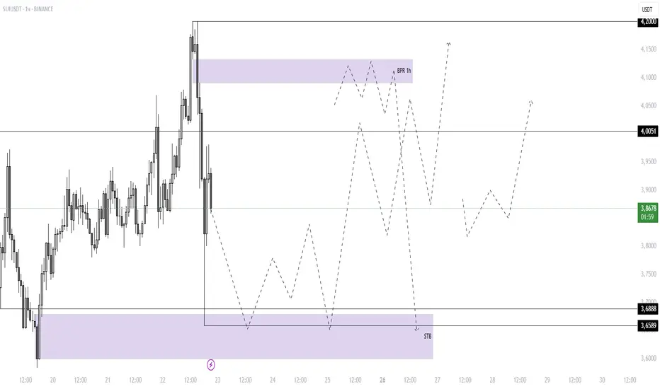 Зона BPR 1h в районе 4.05–4.20 остаётся ключевым ориентиром для фиксации прибыли. Именно здесь ранее происходило распределение и формирование временного хая, после чего цена была отвергнута. Возврат в эту область подтвердит готовность рынка к расширению в более высокий диапазон.
