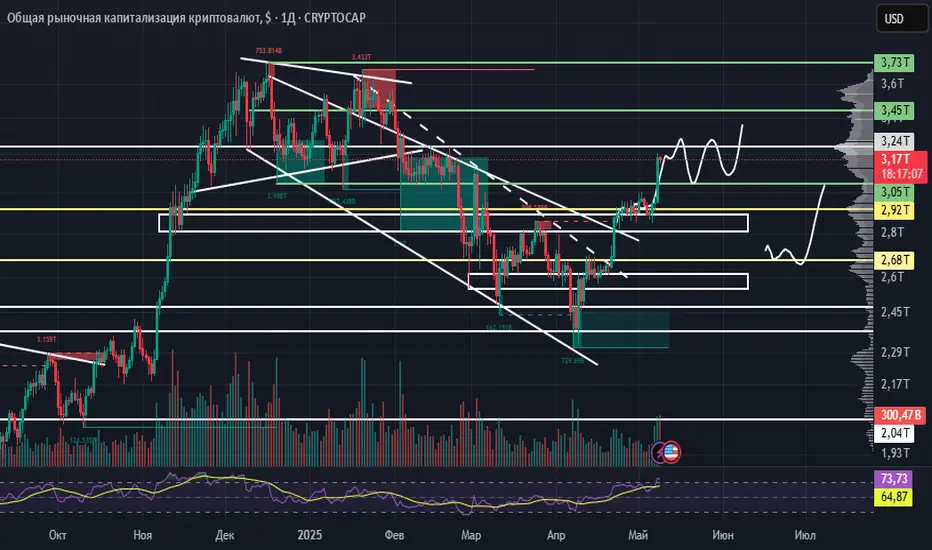 Если импульс сохранится и TOTAL пробьет уровень $3,1–3,25 трлн, следующая цель – исторический максимум свыше $3,69 трлн, это приведет к росту интереса институционалов к крипторынку.