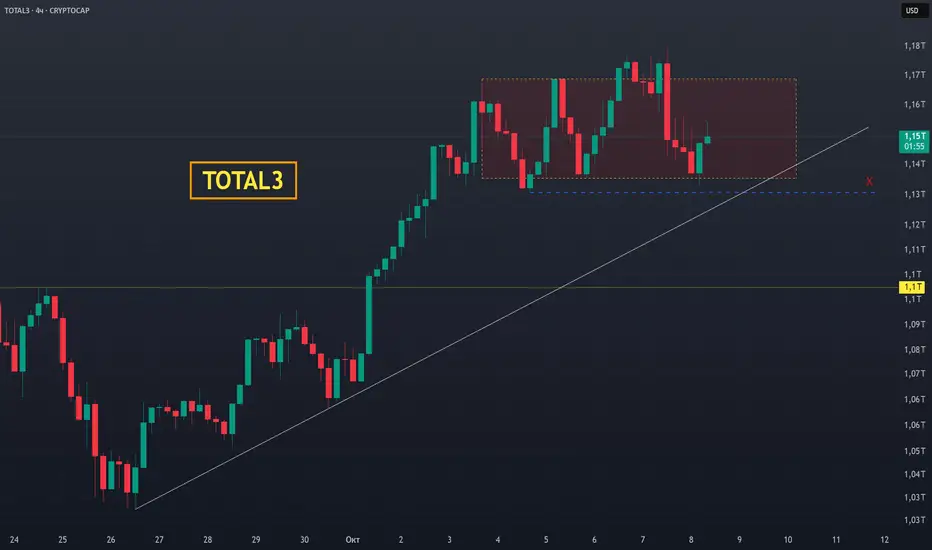 Как же хочется зашортить альту, но в отличии от битка капа альтов еще не сломала свой тренд. Альты соответственно ведут себя разнонаправленно. Пробой уровня 1,13 трлн. открывает цель 1,1 трлн. Уровень который многократно выступал и поддержкой и сопротивлением.