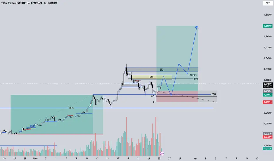 📉 #TRX/USDT на 4H сформировал чёткую зону спроса на уровне 0.30–0.315 после коррекционного отката. Цена протестировала Order Block покупателя и уверенно двигается вверх.
