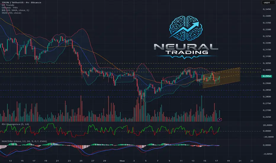↔️ Диапазон консолидации: После падения цена зашла в боковик с примерными границами $0.2890 (поддержка) и $0.2985 (сопротивление). Торговля идет внутри этого коридора.