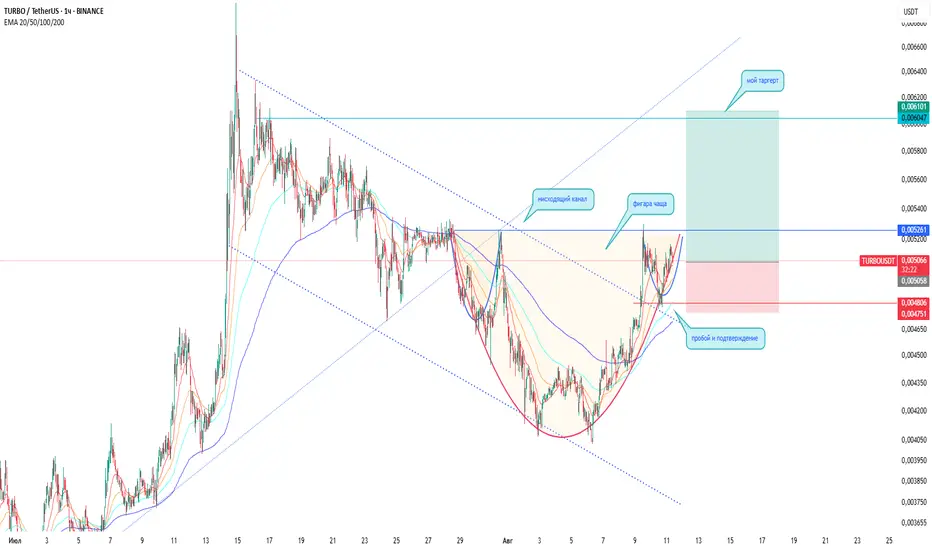 На часовом графике цена сформировала фигуру Чашка с ручкой вблизи верхней границы нисходящего канала. Произошел пробой локального сопротивления 0.00526 и его повторный тест, что подтверждает сценарий роста. Ближайшая цель 0.00604–0.00620, где проходит зона потенциальной фиксации прибыли. Поддержка расположена в районе 0.00475–0.00480, её пробой отменит лонговую идею.