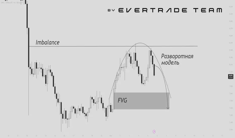 Ниже остаётся неотработанный Fair Value Gap, который выступает сильным магнитом ликвидности и вероятной зоной притяжения цены.