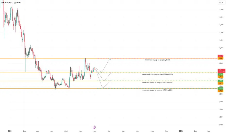 Пунктирная зеленая линия лимитный ордер на покупку (6.784 200$; 5.722 300$; 4.729 500$).