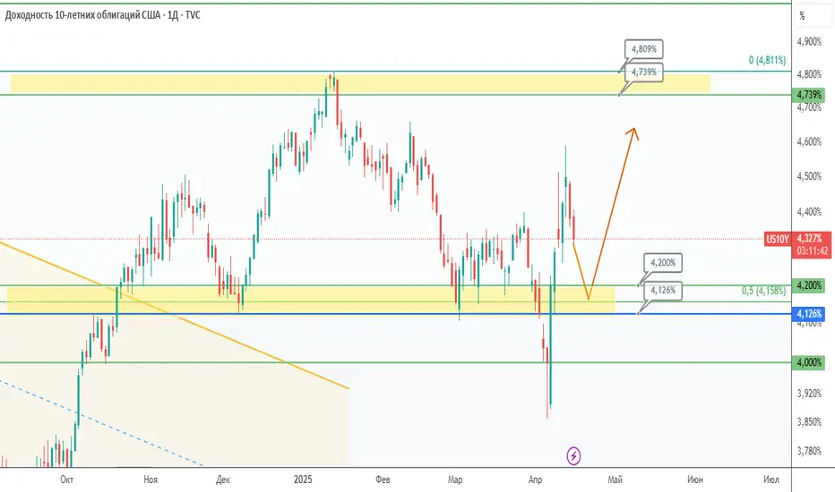Доходность по десятилетним облигациям США, после ложного прорыва области поддержки 4.126-4.200, с огромной силой полетела вверх, но после очередного геополитического трюка решила восстановиться до обозначенной области. Подход и тестирование указанной выше поддержки увеличивает шансы на то, что быки активно включатся в игру, повышая ставку в район 4.8%. Текущая коррекция - довольно распространенное явление после такого взрывного роста. Напомним, что при росте доходности бондов цена на них падает, и наоборот.