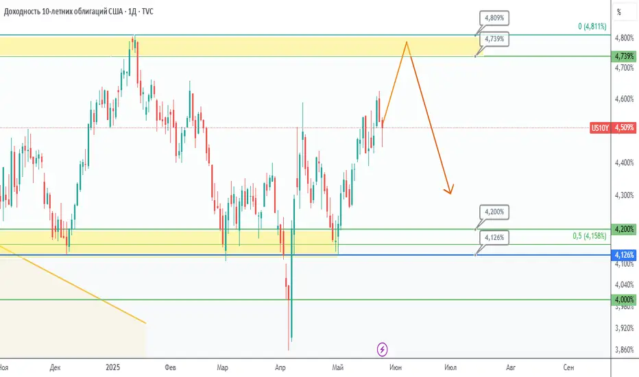 Котировки американских "десятилеток" продолжают показывать прогресс в повышении, видимо, нацелившись на область сопротивления в районе 4,8%. Скорее всего, данную область будет трудно преодолеть и мы увидим разворот доходностей с последующим снижением вниз.