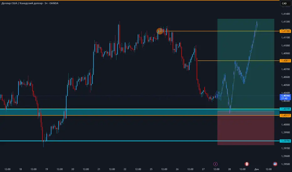 Сегодня рассматриваем сценарий по валютной паре USDCAD. На данный момент цена актива демонстрирует локальное снижение котировок, приближаясь к фундаментальной области 1.40199–1.40117, которая выступает в роли ключевой поддержки. Диапазон сформирован на старшем таймфрейме и, как правило, имеет приоритет. Потенциал снижения уже незначительный. Глобальная тенденция по активу остаётся восходящей: обновляются локальные максимумы при отсутствии обновлений минимумов. USDCAD получает поддержку со стороны слабости канадской экономики: последний отчёт показал замедление ВВП Канады и снижение потребительской активности, тогда как Bank of Canada сохраняет мягкий тон и допускает дальнейшее снижение ставки. На этом фоне дифференциал доходностей смещается в пользу доллара США, особенно после того, как ФРС дала сигнал, что будет действовать осторожно, но готова удерживать ставку дольше рынка. Дополнительное давление на CAD создаёт нефтяной рынок: котировки Brent и WTI остаются волатильными и продолжают обновлять локальные минимумы, что традиционно негативно влияет на сырьевые валюты, в первую очередь канадский доллар. При этом доллар США остаётся устойчивым из-за спроса на защитные активы и роста доходности трежерис. Инвесторы также отмечают приток средств в доллар на фоне глобальной неопределённости и ослабления товарных рынков. При такой формации наиболее рационально рассматривать точку входа на покупку. Поэтому выставляем лимитный ордер в лонг от границы ключевой области поддержки.