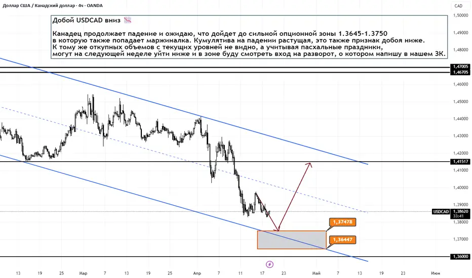 Канадец продолжает падение и ожидаю, что дойдет до сильной опционной зоны 1.3645-1.3750