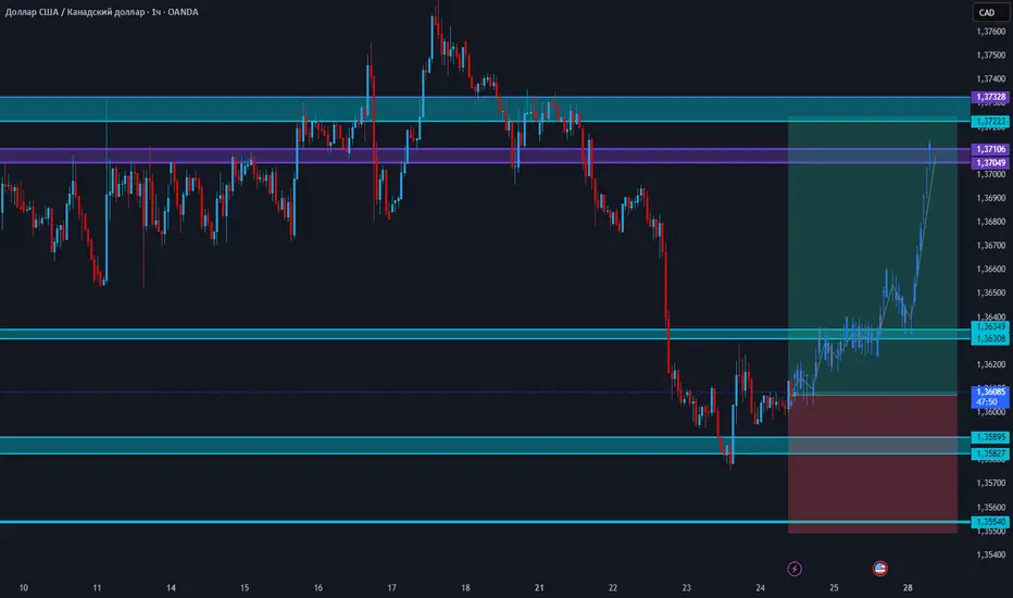 Продолжаем рассматривать сценарий по валютной паре USDCAD. Вчера мы заходили в покупку данного актива, забрали внутридневное спекулятивное восходящее движение. Сегодня предлагаю повторить успех, продолжая рассматривать точку входа в лонг. Протестировав фундаментальную область поддержки 1,35895 - 1,35827, сформировался явно выраженный отскок. Наблюдается поджатие к области сопротивления 1,36308 - 1,36349 с целью пробития. Спекуляции насчет увольнения главы ФРС Пауэлла спровоцировали распродажи доллара, стимулировав рост CAD. Но экономические данные США (рост экономики, розничные продажи) оказывают поддержку доллару. Разрыв между ставками Банка Канады и ФРС влияет на курс: больший дифференциал в пользу США ослабляет CAD. При текущей формации, в рамках внутридневной торговли, наиболее рационально рассматривать точку входа в лонг, так как потенциал роста значительнее снижения. Тест поддержки уже был, поэтому заходим в покупку по рынку.