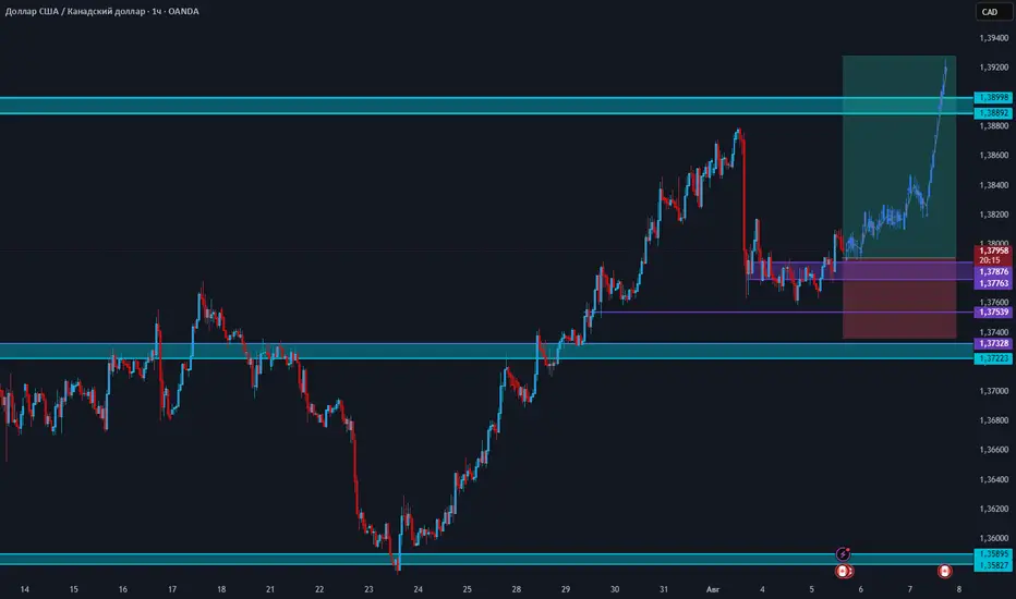 Итак, сегодня рассмотрим сценарий по валютной паре USDCAD. Недавно, 24 июля, мы заходили в лонг данного актива, забрали хорошее восходящее движение. Сегодня предлагаю повторить успех, думаю, большинство будет только за. После краткосрочной нисходящей коррекции от области сопротивления 1,38892 - 1,38998 сформировалась новая область 1,37763 - 1,37876, которая сейчас выступает в роли поддержки, так как произошло закрепление выше. Новообразованные области и уровни всегда в приоритете, так как задают актуальную рыночную тенденцию. При текущей формации, в рамках внутридневной торговли, наиболее рационально рассмотреть точку входа в лонг, так как потенциал роста значительнее снижения. Выставляем лимитный ордер на покупку от границы верхней области поддержки.