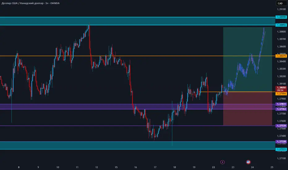 Сформировав новый уровень 1,37994 и проторговавшись ниже, цена через ретест фундаментальной поддержки 1,37831 - 1,37763 вернулась и закрепилась выше. Сейчас новообразованный уровень выступает уже в роли поддержки. Новые уровни и области всегда в приоритете, так как задают актуальную рыночную тенденцию. USDCAD получает поддержку от дифференциала ставок: Банк Канады уже снизил ставку до 2,5% на фоне рецессии и роста безработицы, тогда как ФРС действует осторожнее, сохраняя реальные доходности положительными. Канадская статистика слабеет - занятость падает, инфляция всего 1,9% г/г, что открывает путь к дальнейшему смягчению. Дополнительный минус для CAD - низкие цены на нефть, ухудшающие экспортные условия. Всё это усиливает аргументы за лонг USDCAD с тактикой «покупай на проливах». При текущей формации, в рамках внутридневной торговли, наиболее рационально рассмотреть точку входа в лонг. Тест поддержки уже был, поэтому заходим по рынку в покупку.