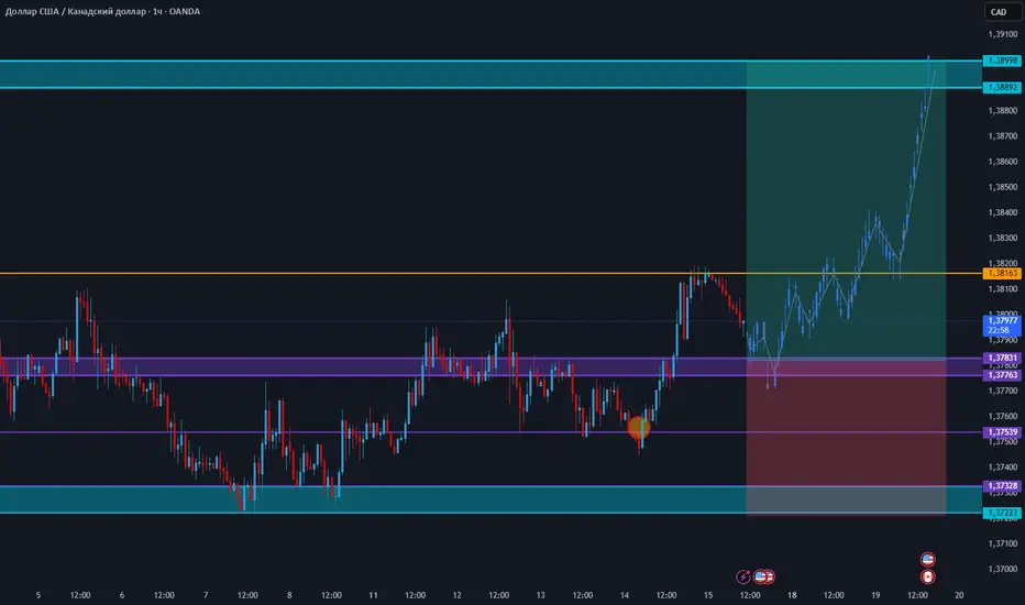 Сегодня рассмотрим сценарий по валютной паре USDCAD. На данный момент наблюдается коррекционное движение в рамках локального восходящего ценового канала. Обновляются максимумы, при этом нет обновления минимумов. Все актуальные уровни и области сформированы ниже текущей цены, выступая в роли поддержек. Факторы в пользу доллара: инфляция в США остаётся выше таргета (3,1% г/г), а свежий PPI усилил риски «осторожной» ФРС → реальные доходности/доллар остаются привлекательными. Факторы против CAD: Банк Канады расколот по дальнейшим шагам и признаёт слабость спроса; рынок видит повышенную вероятность снижения ставки уже в сентябре, что сужает дифференциал доходности в пользу CAD. Инфляция в Канаде невысока: июньский CPI 1,9% г/г; релиз за июль выйдет 19 августа - если подтвердит слабость, это также негатив для CAD. При такой формации наиболее рационально рассматривать точку входа в лонг, так как доллар сильнее CAD, соответственно потенциал роста значительнее снижения. Ниже текущей цены сформирована область поддержки 1,37831 - 1,37763. От границы данной поддержки выставляем лимитный ордер на покупку.