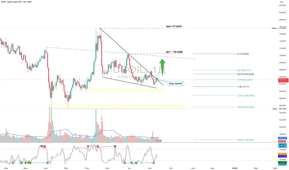 Техническая картина по WTI остаётся двусмысленной: цена подошла к нижней границе сходящегося клина и тестирует область потенциального разворота, отмеченную как buy zone. Пока что удержание диапазона 62–63 выглядит критически важным для быков, ведь пробой вниз откроет дорогу к уровням 61.30 и далее 58.80. С другой стороны, отскок от текущих отметок способен развернуть цену к 70.50, а при развитии импульса и к 77.60. Стохастик на дневке показывает признаки локального разворота вверх, что подталкивает к мысли о возможном краткосрочном отскоке.