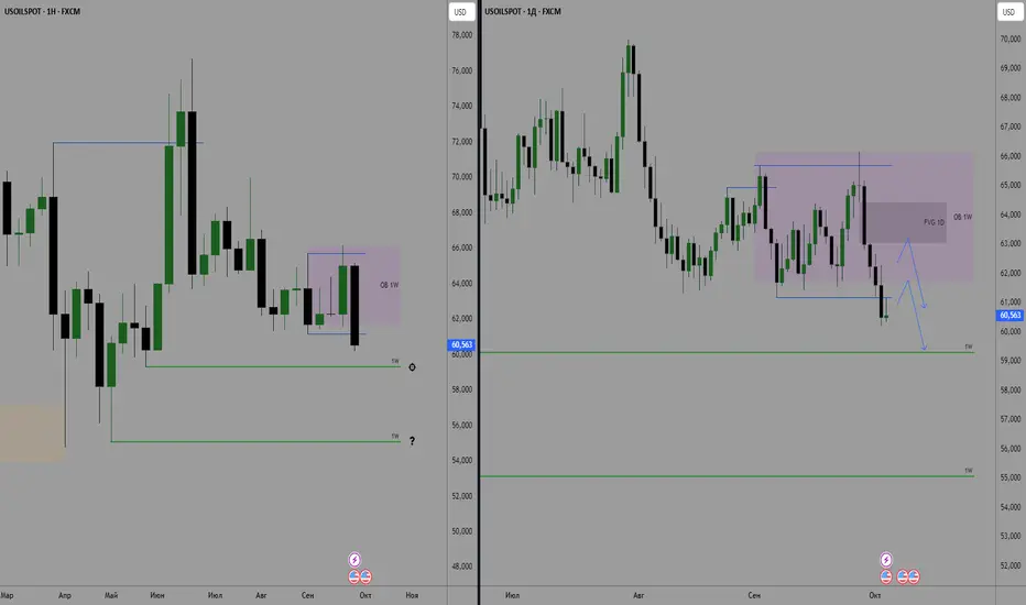 Цена формирует медвежий OF на недельном ТФ в виде очередного 1W OB, ожидаю продолжение снижения через тест 1W OB, первая цель на отметке $59.
