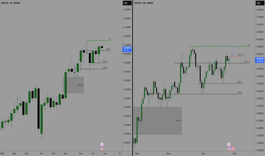 Сохраняется лонговый 1W OF, цена протестировала 1W RB и сформировала 1W OB, достижение верхней цели 1W FP на отметке 39,5 считаю высоковероятным.