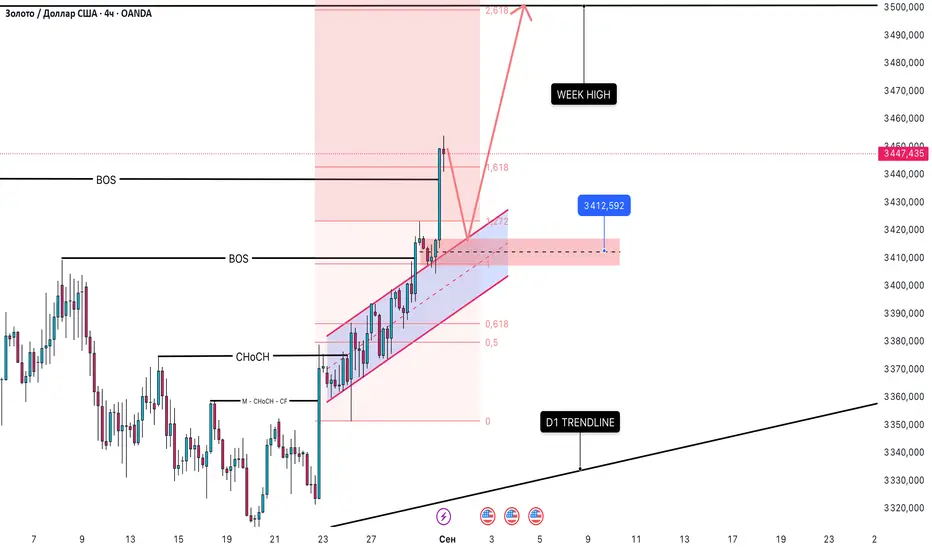 План предполагает, что цена золота вырастет после коррекции до зоны спроса 3410 - 3425. Если рынок достигнет этой зоны при открытии, это будет указывать на силу "быков". В таком случае цена, скорее всего, вырастет до 3500.