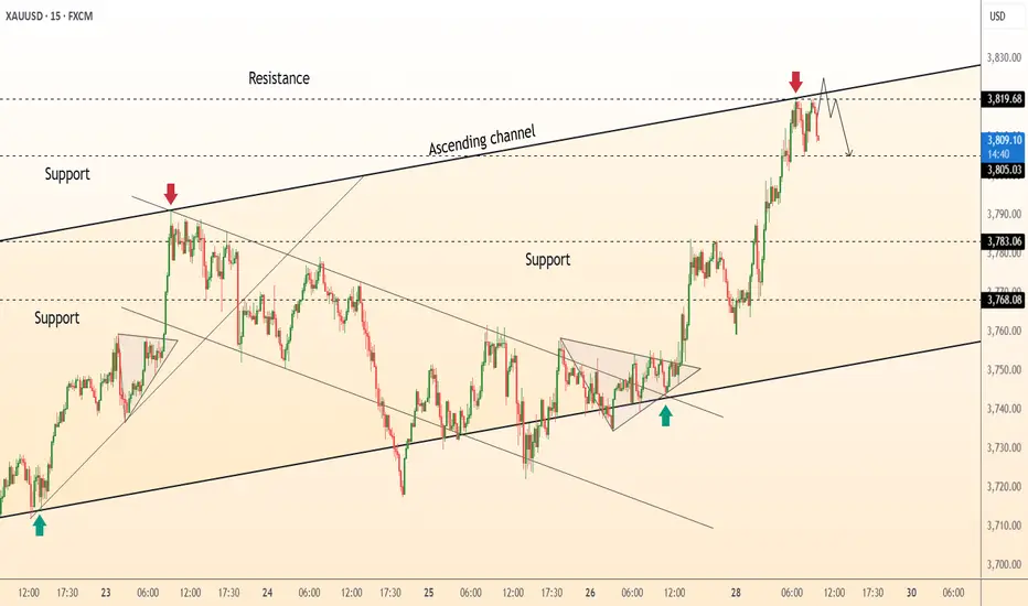 ● XAU/USD hit resistance at 3819 within the ascending channel, showing rejection signals and forming a possible reversal pattern.