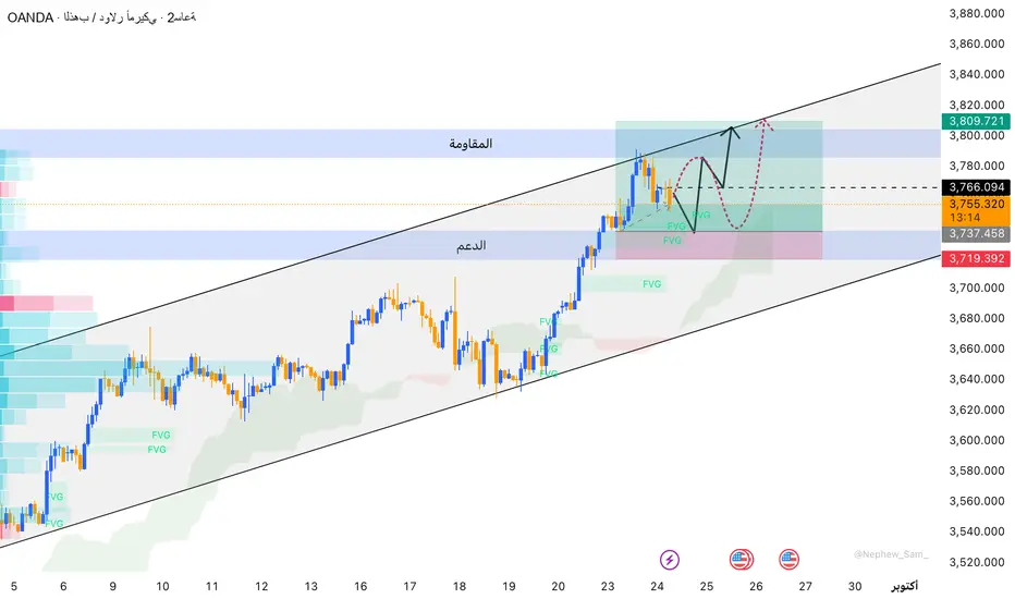 من الناحية الفنية، فجوات القيمة العادلة (FVG) تبرز كمستويات محورية: العلوية عند 3765–3780 كمقاومة، والسفلية عند 3725–3740 كمنطقة ارتكاز. تزايد أحجام التداول مع اختراق القمم السابقة يدعم استمرارية قوة الشراء.