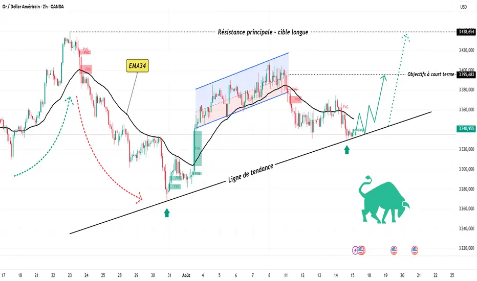 Personnellement, je privilégie la stratégie suivante : attendre un retour du prix vers la zone de soutien (ligne de tendance + FVG) entre 3 340–3 345 $, prendre un premier bénéfice autour de 3 395 $, et viser plus haut vers 3 438 $ pour l’objectif final.