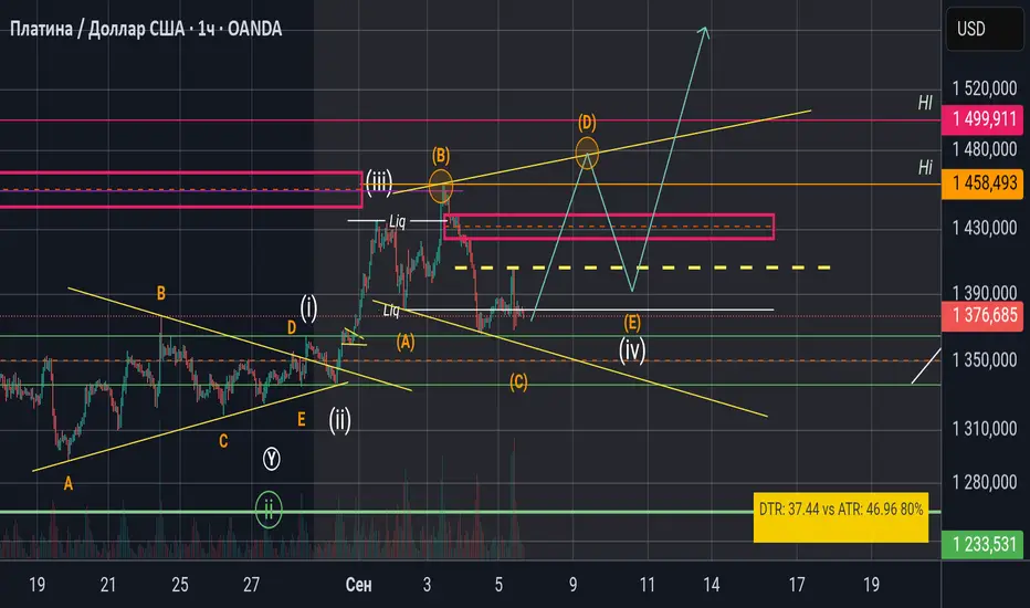 Цена формирует расширенный треугольник А-В-С-D-Е . после чего ожидается движение цены вверх.