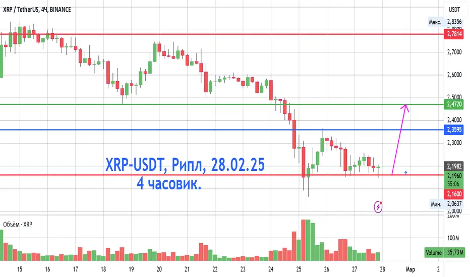 XRP-USDT, 4 часовик, Лонг от уровня 2.16, Ордер стоп-лосс под уровень по своим рискам, Цели - 2.35 и 2.47