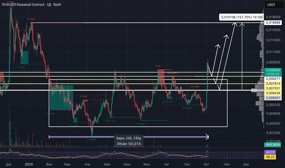 Что касается технического анализа, монета была в накоплении 245 дней, и на днях произошёл импульсный пробой. Ожидаю возврат за ретестом зеркального уровня (в данном случае, сопротивление стало поддержкой). Думаю, что на фоне возможного общего снижения актив может просесть ещё сильнее.