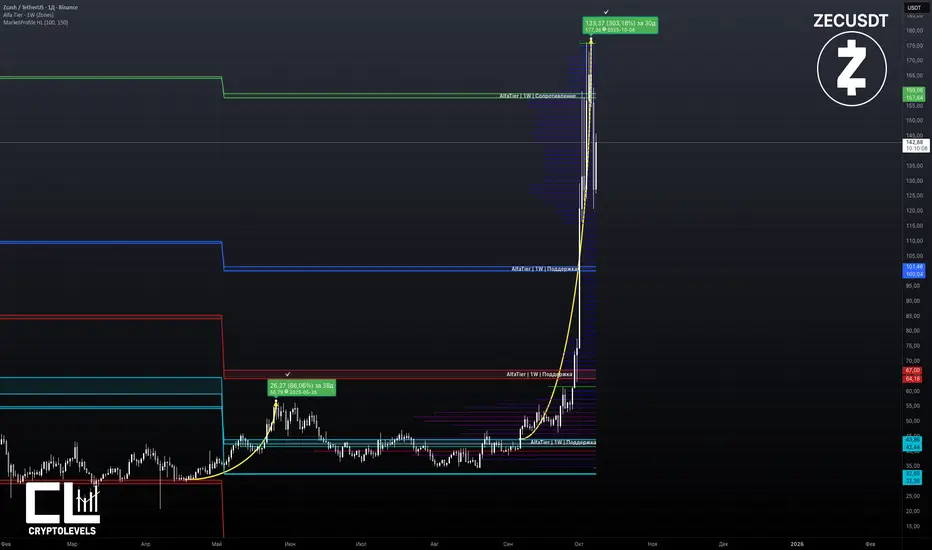 После колоссального роста Zcash более чем на 300% от нижних поддержках монета уперлась в недельное сопротивление в зоне 157.64-159.06. Именно здесь рост закономерно остановился, и сейчас можно наблюдать формирование накопления.