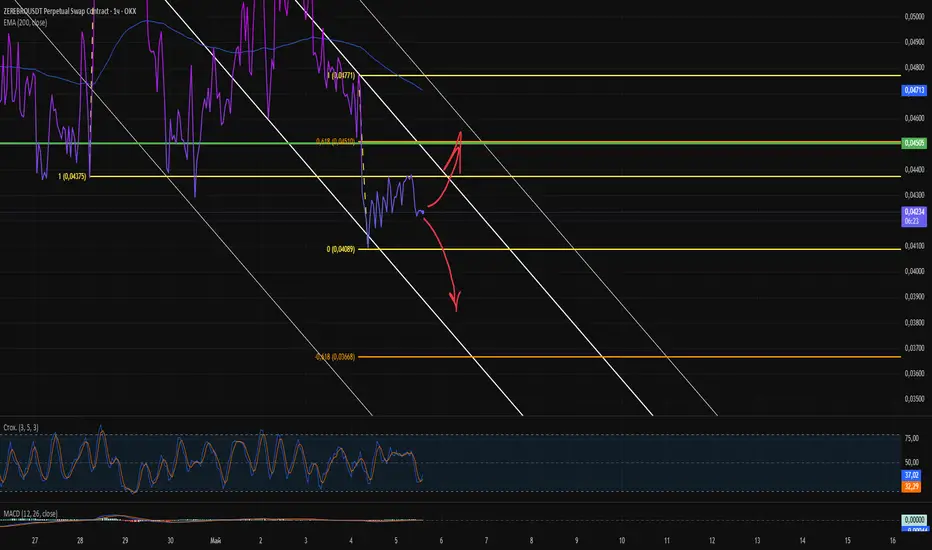 На часовом графике ZEREBRO (текущая цена: 0.04267) мы видим чёткий нисходящий тренд. Цена движется в рамках канала, и пока нет явных признаков разворота.