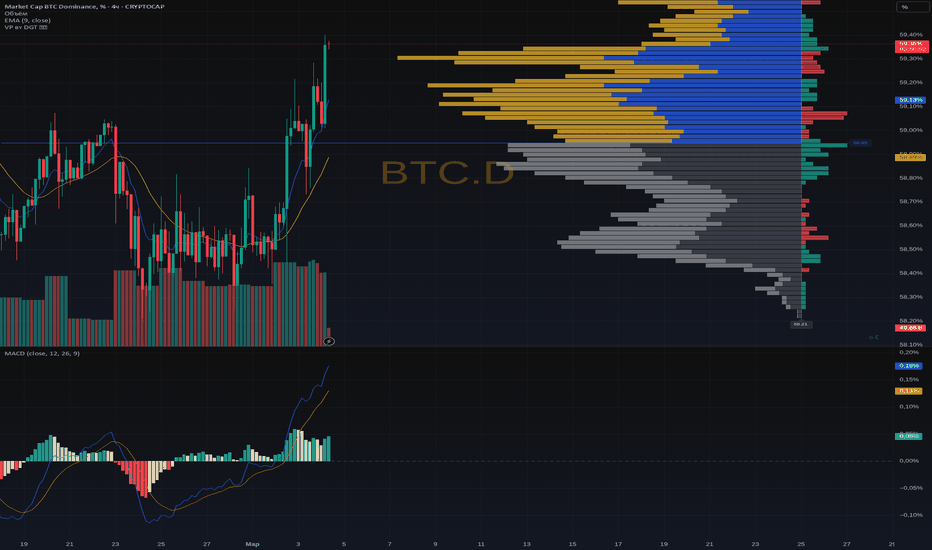 На 4-часовом графике доминация уперлась в плотный объёмный уровень по профилю около 59.3-59.5, где раньше уже шли серьёзные продажи. MACD и RSI оба перегреты, импульс почти вертикальный - классический вынос вверх в зону сопротивления. Возможно, я ошибаюсь, но этот памп доминации больше похож на финальный рывок, чем на спокойный устойчивый тренд.