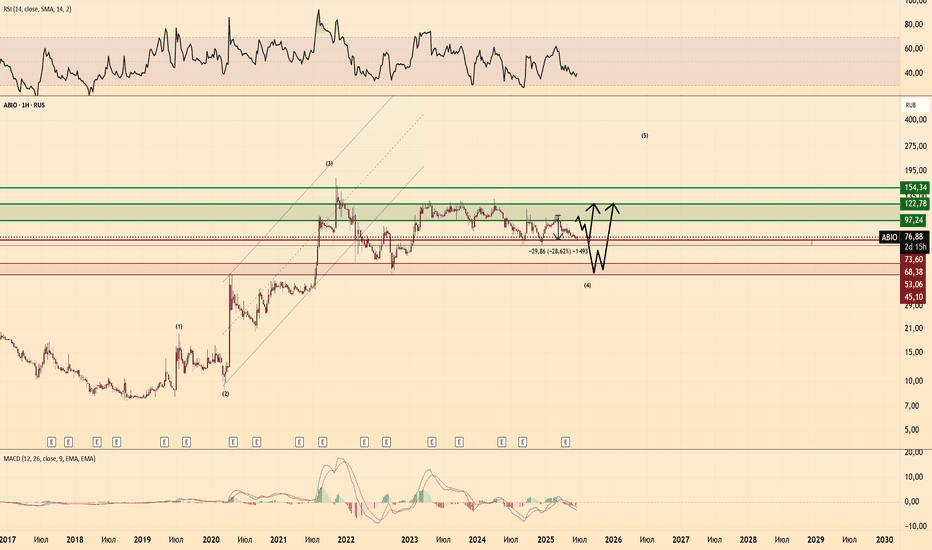 Выглядит как крупная пятиволновка и сейчас расторговывается 4 волна, цель пятой волны в долгосрок 97.24 - 122.78. Мы подошли к первой поддержке: 73.60 - 68.38 возможен отскок, но пока только отскок - дальше надо будет смотреть.