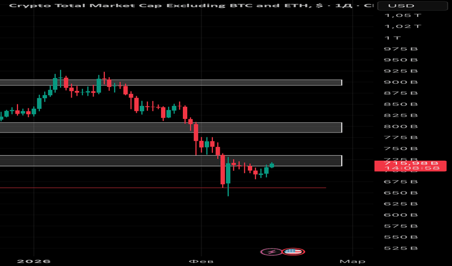 OTHERS: попытка отскока после капитуляции альткоиновИндекс OTHERS (капитализация рынка без топ-10) на дневном таймфрейме остаётся в нисходящей структуре. После резкого пролива рынок протестировал зону сильной поддержки ~145–160B и показал быстрый выкуп — типичный признак локальной капитуляции. Сейчас цена консолидируется ниже ключевых сопротивлений и под динамическим давлением, что говорит о фазе восстановления после сильного стресса.