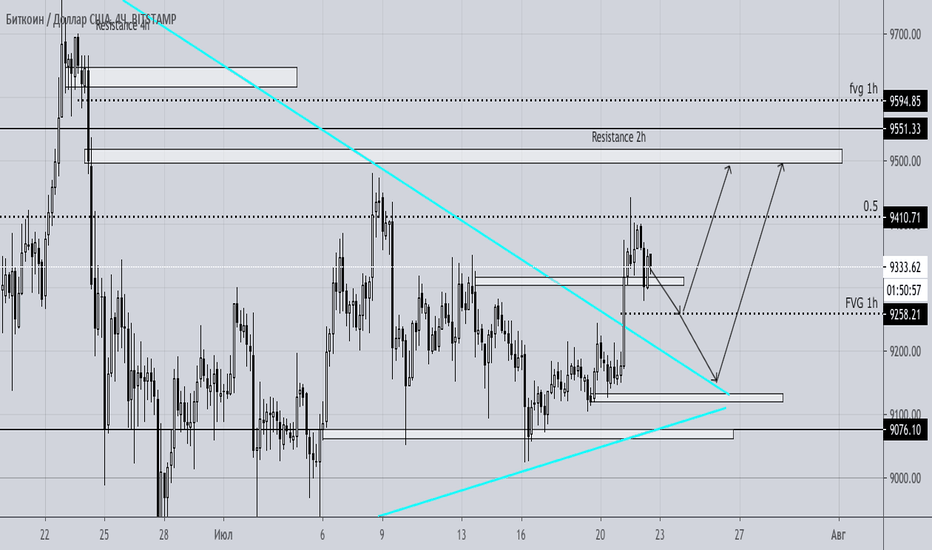 Локально я бы пока рассматривал лонг позицию, начать можно набор с текущих(~9310) - Брейкер 1ч, но я не советую. Комфортная точка входа - перекрытие FVG 1ч - 9258 с добором у теста треугольника с которого мы вышли. Стоп за поддержку 4ч - 9120. Цель - ретест сопротивления 9500.