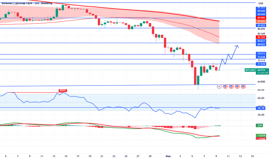 Вероятный сценарий — коррекционное движение вверх к зонам 73–76k (ступенчато), но глобально структура остаётся медвежьей. Это больше похоже на отскок в нисходящем тренде, а не на разворот. Для подтверждения силы нужно закрепление выше ключевых уровней сопротивления.
