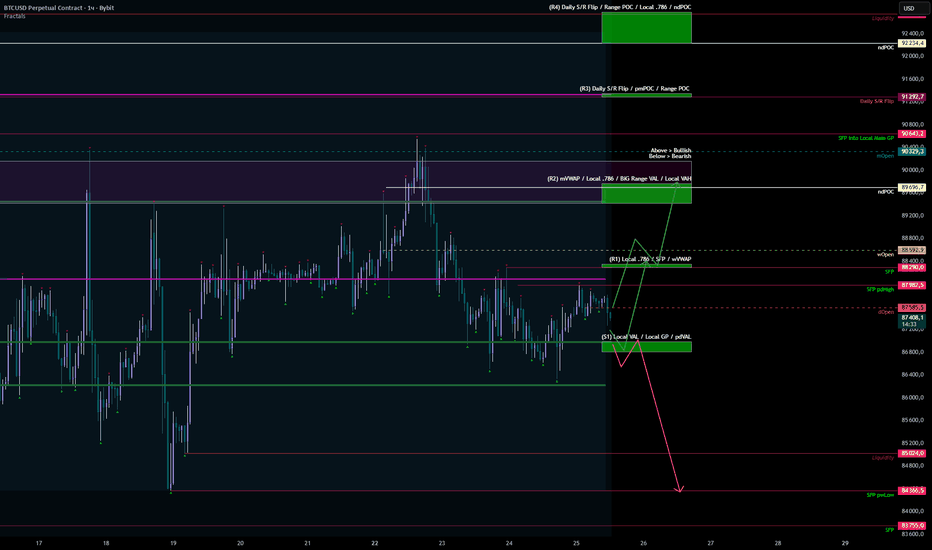 BTC 24.12 NeutralНичего не изменилось со вчера, минимально волатильности было, даже не дошли никуда ни в какую сторону. Уровни на сегодня такие же, немного изменились по ширине разве что. Потихоньку подползаем к S1, рассмотрю лонг от неё, войду если увижу лтф диверы на MCB на тфах до 1ч, с целями снова до верхней границы ~90к. Если потеряем S1, буду смотреть уже на шорт от ретеста S1 с целями до снятия pwLow и S2.
