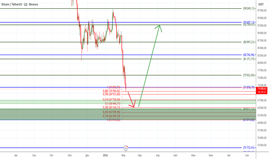 Пометил жирные уровни, от которых можно искать точки входа: Зона 63 000$ - 68 000$, я думаю это будет приблизительно зона 67 000$ - 67 500$