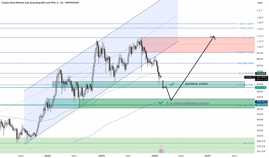 2️⃣Но если посмотреть еще глобальнее - самая оптимальная зона ОТЕ - еще ниже, там и 365 глобальная разворотная скользящая , и блок покупателя ииии золотое сечение - коррекция всего глобального графика по TOTAL3